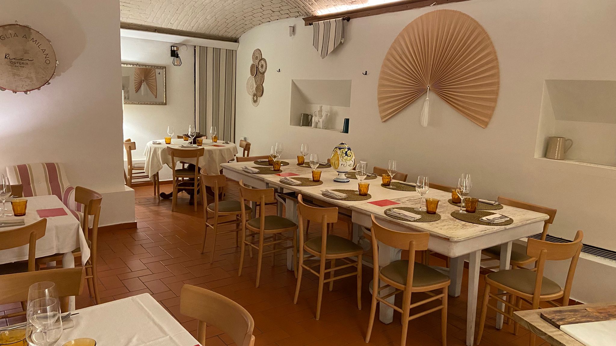 Il locale, aperto esclusivamente a cena e la domenica, si sviluppa su due livelli e accoglie gli ospiti in piccole sale raccolte, dove l’atmosfera è calda e piacevole, illuminata da luci soffuse e avvolta da profumi che invitano alla convivialità. Alle pareti, gli strofinacci appesi richiamano le antiche masserie pugliesi, evocando un senso di familiarità e di autentica tradizione che accompagna ogni piatto.