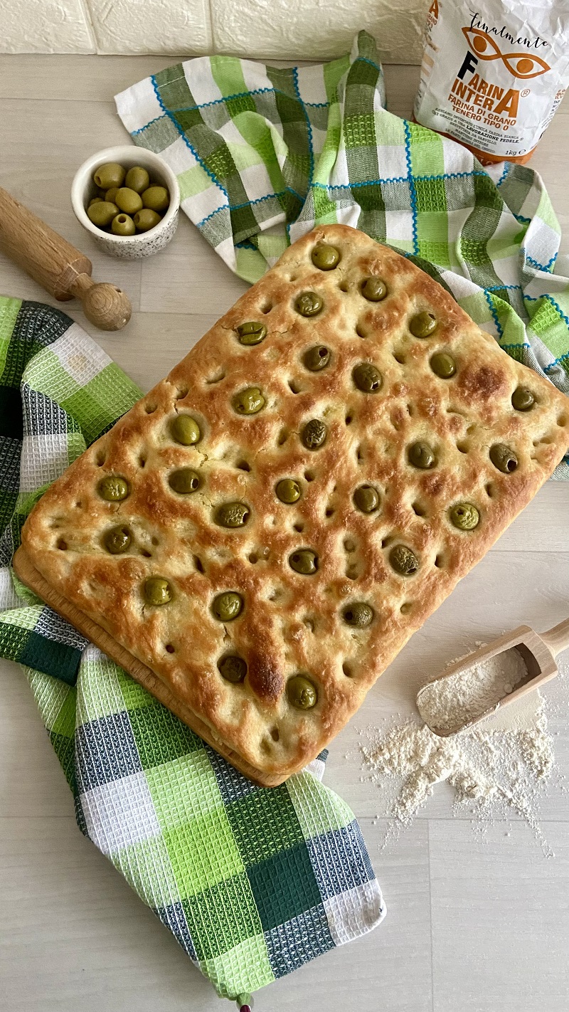 Il bello è che potete personalizzarla senza complicarvi la vita: olive verdi, olive nere o un mix, magari con un tocco aromatico se aggiungete origano o rosmarino. Questa è la tipica focaccia con i “buchini” in superficie: per capirci quelli che accolgono in modo perfetto la salamoia e che la rendono morbidissima. Vi basterà lavorare bene la superficie con i polpastrelli prima di condire ed il gioco è fatto.