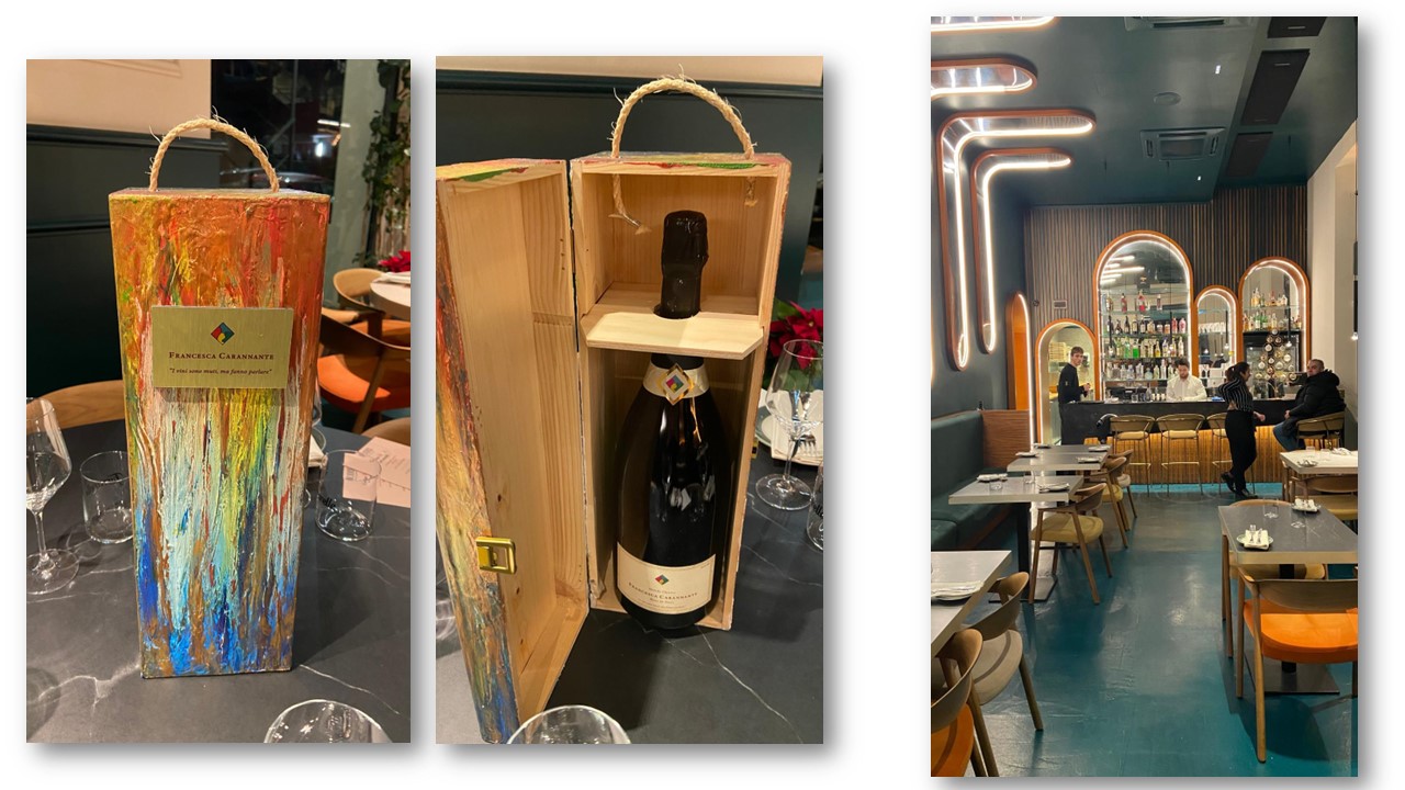 L’esperienza è stata accompagnata per tutta la serata da una selezione di vini, che spaziava da un Extra Brut a un Brut Rosé, scelta per valorizzare l’intero menu. I vini erano a cura della cantina di Francesca Carannante, che ho soprannominato “artista del vino”: oltre a produrre etichette eccellenti, grazie alla sua formazione e alla passione per l’arte, ha realizzato eleganti scatole per contenere le bottiglie.