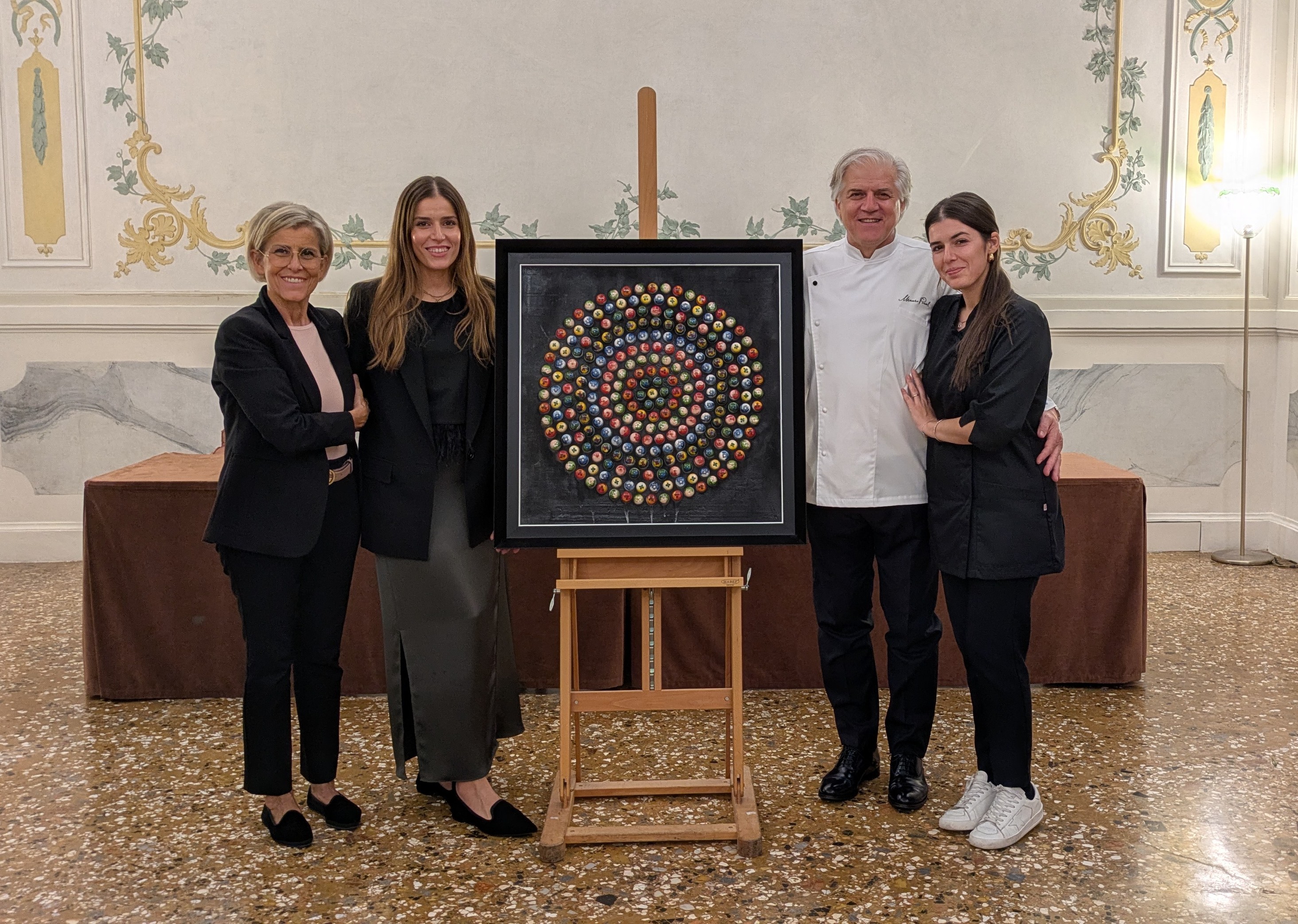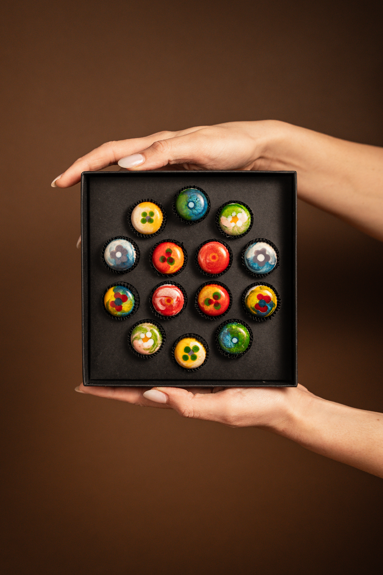 Ogni ripieno richiama sapori e profumi tipici della tradizione veneziana, mentre il rivestimento è costituito da un sottilissimo guscio di cioccolato, decorato manualmente con quattro diverse tecniche che ne valorizzano i riflessi, la brillantezza e l’armonia dei colori.