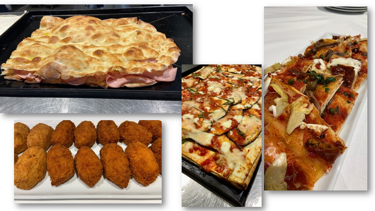 Accanto alla pizza alla romana, in menu ci sono anche pizza alla pala, pizza baciata e classici romani come i supplì al telefono (nelle versioni al ragù, cacio e pepe, o pomodoro e mozzarella), mentre i più golosi possono optare per la versione dolce ripiena di mele o di crema al cacao e nocciole.